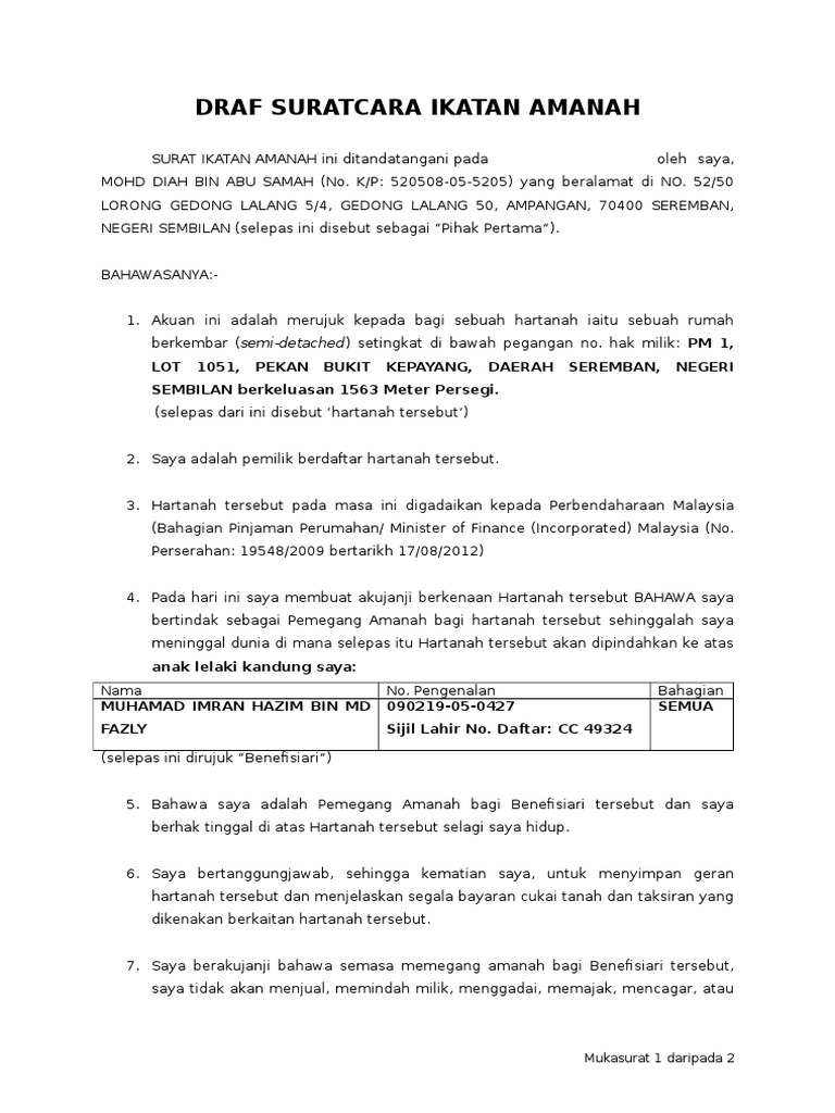 B Surat Ikatan Amanah ini dan segala wang harta alih dan tak alih pelaburan yang akan dipegang sebagai amanah oleh mereka pada masa-masa akan datang dan menjual serta. Senarai Semak Pindaan Surat Ikatan Amanah. Surat ikatan amanah yang ditandatangan ini mengandungi terma dan syarat pengamanahan dan.